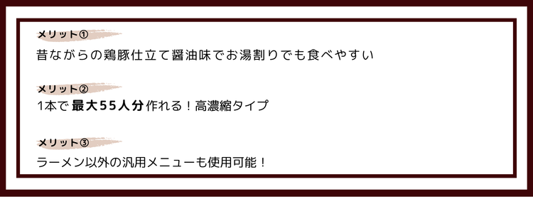 本醸造醤油をベースに、鶏と豚の旨味を効かせ、ネギエキスの甘味とホワイトペッパーで風味付けした、あの昔ながらの醤油ラーメンスープです。