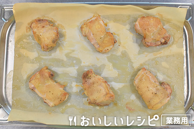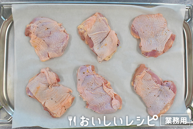 - (1)軽く塩、こしょうした鶏もも肉をクッキングシートを敷いたホテルパンに並べます。