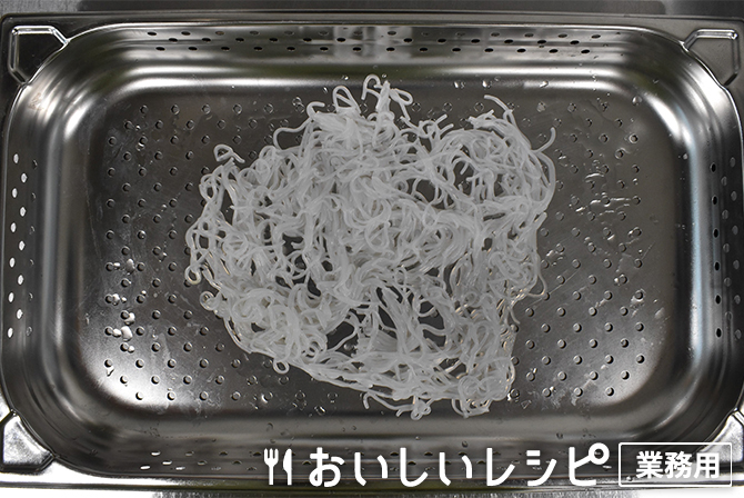 - (1)穴あきホテルパンにしらたきを広げ、予熱したスチームコンベクションオーブンでスチーム100%・3分加熱します。