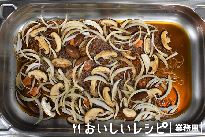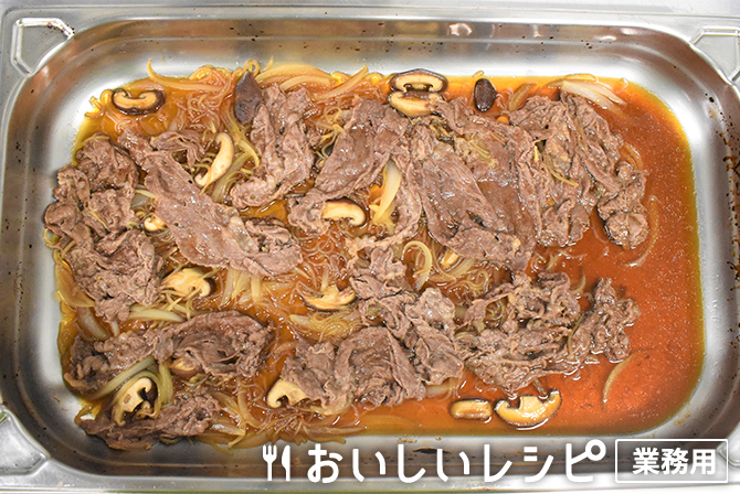 - (2)深めのホテルパンに(1)、玉ねぎ、椎茸、にんじん、厨房応援団 すき焼のたれを入れ蓋をします。スチームコンベクションオーブンでコンビ温度180℃・湿度100%・10分加熱します。