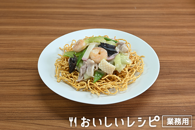 - (6)皿に皿うどん用揚げ麺を盛り、(5)をかけ出来あがりです。