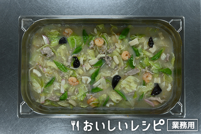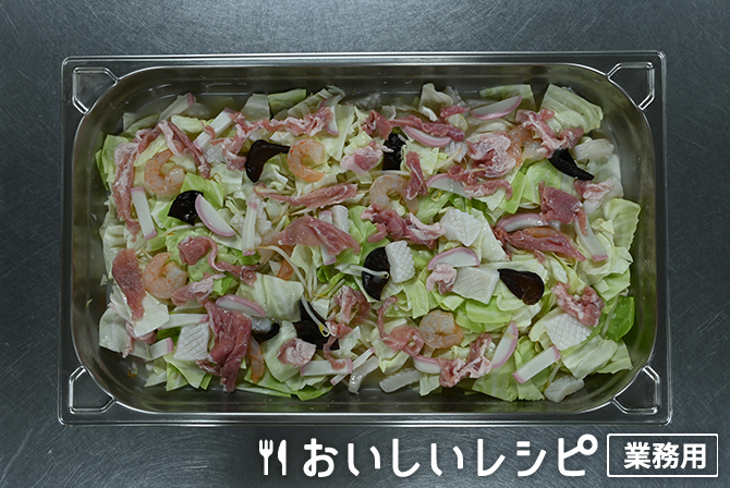 - (3)深めのホテルパンにキャベツ、もやし、きくらげを入れ、片栗粉(野菜用)をふりかけ粉気がなくなるまであえます。混ぜ合わせたちゃんぽんスープ、お湯またはがらスープを注ぎ入れ、へらで混ぜます。(2)、むきえび、いか、かまぼこを広げながらのせ、蓋をします。160℃に予熱したスチームコンベクションオーブンでコンビ、温度160℃・湿度100%・10分加熱します。